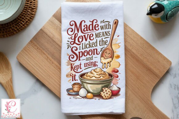 This design hilariously captures the joy of baking with the relatable confession, “Made with love means I licked the spoon and kept using it.” A must-have for every baking enthusiast!