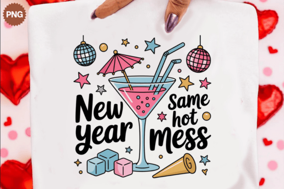 Inject some playful humor into your celebrations with this ‘New year Same hot mess’ design, featuring a festive cocktail and sparkling elements, perfect for any fun-loving occasion.