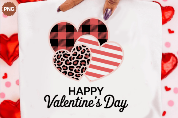 Show your love in style with this ‘Happy Valentine’s Day’ design featuring three charming hearts adorned with popular plaid, leopard, and stripe patterns.