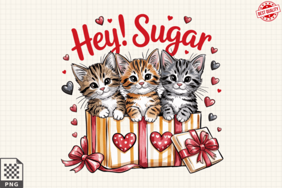 Melt hearts with this irresistibly cute ‘Hey! Sugar’ design, showcasing three adorable kittens peeking out of a Valentine’s gift box, perfect for animal lovers.